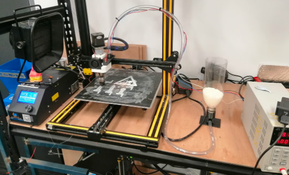 您无法通过常规的 FDM 耗材挤出机-熔化器组件来处理颗粒。要使用颗粒和碎片进行打印,您需要购买颗粒 3D 打印机(请参阅下文的打印机),在机械臂上使用颗粒挤出机系统,或者将您现有的 FDM 打印机改装成带有附加组件的颗粒打印机。