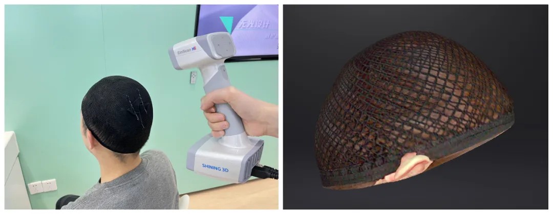 2.使用先临三维EinScan H2双光源彩色手持3D扫描仪围绕客户头部进行360°数据采集。EinScan H2人像模式下采用红外不可见光,采集过程人眼安全舒适。780mm*900mm超大扫描幅面,使其仅需30秒即可生成一个精确的3D数字模型,实现1:1的头型弧度匹配,极大地提升了采集效率和精度。