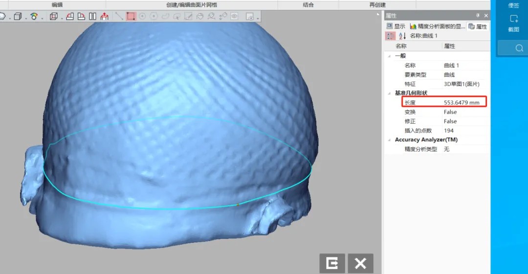 3.将三维扫描仪采集到的数据导入三维软件中,可在软件内直接拟合头围周长,自动计算头围长度。测量的数据相较人工测量方式更精准,且测量数据可实现永久电子化存档,方便客户二次定制时调取使用。