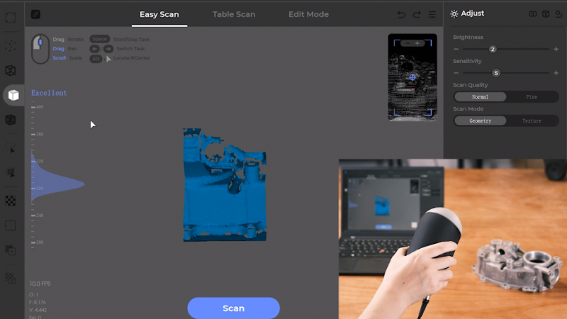 除了拥有0.05mm的高精度外,Mole还采用了高速实时的视觉跟踪技术与光学防抖技术,一方面,在扫描的过程中可实现不贴点扫描,保护扫描物体表面不受损伤;另一方面,在手持扫描模式下,即便是快速晃动,扫描过程也丝毫不受影响,扫描效果稳定流畅,扫描效率高。