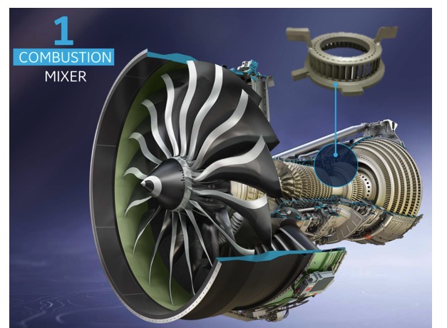 每个 GE9X 发动机设有 1 个燃烧室油气混合器,由钴铬合金以 3D 打印的方式制成。传统工艺在保证档板加工的一致性方面存在较大难度,而借助 3D 打印一体成形不仅能够确保这一点,还能够减轻 6%的重量并使使用寿命延长 3 倍。