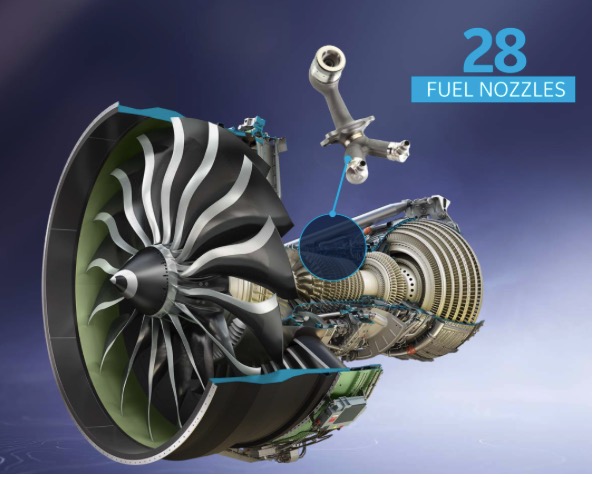 每个 GE9X 发动机配备了 28 个燃油喷嘴,其采用钴铬合金材料,借助 3D 打印技术把 20 个零件整合成了一个。如此一来,寿命延长了 5 倍有余,重量减轻 25%,成本降低 30%。