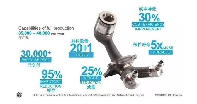 铝合金(F357)粉末,借助增材技术将原本的 163 个零件合并为一个,不但减轻了 40%的重量,还削减了 25%的生产成本。