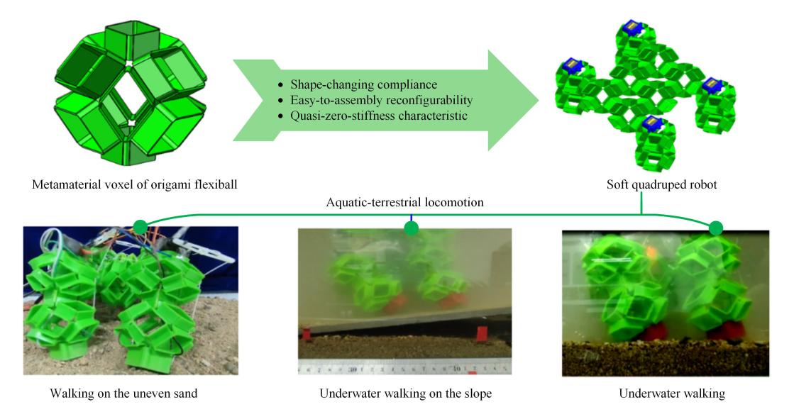 水的密度约是空气的800倍,其粘性是空气的55倍,这种物理特性差异给水陆两栖机器人设计带来巨大挑战。特别是深水或深海行走机器人还要面对较大的静水压力。近日,北方工业大学胡福文课题组通过揭示折纸弹性球模型所蕴含的超材料变形机制,成功研制了一类新型可3D打印的体素型软体四足水陆两栖爬行机器人。