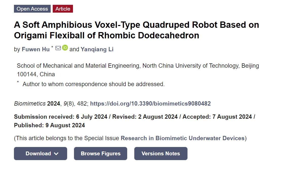 2024年8月,北方工业大学胡福文课题组在国际学术期刊《Biomimetics》发布了《折纸启发的水陆两栖软体爬行机器人》一文。