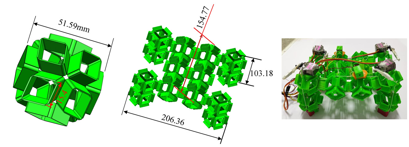 这款机器人的灵感来源是一种折纸弹性球模型。他们的研究揭示了此折纸模型蕴含的多自由度柔顺性、易于组装的可重构性、准零刚度变形等迷人特性。机器人本体由14个3D打印的折纸弹性球模型组装而成,从结构上来说具有“极简性”,具有制造成本低、可模块化扩展等优点。