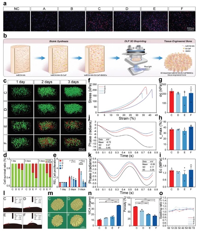 在初步筛选出维持细胞活性的bdECM-MA和Si-CaP浓度后,根据浓度进行匹配和分组,最终确定了六种生物墨水:5% bdECM-MA + 0.5 mg mL−1 Si-CaP(A组),5% bdECM-MA + 1 mg mL−1 Si-CaP(B组),10% bdECM-MA + 0.5 mg mL−1 Si-CaP(C组),10% bdECM-MA + 1 mg mL−1 Si-CaP(D组),20% bdECM-MA + 0.5 mg mL−1 Si-CaP(E组),以及20% bdECM-MA + 1 mg mL−1 Si-CaP(F组)。为了评估这六组的生物相容性,本文进行了另一次CCK-8测定。结果表明:所有六组都对细胞活性有积极影响,其OD值显著高于NC组。本文进一步研究材料浓度对细胞增殖的影响并选择最佳浓度范围,通过5-乙炔基-2′-脱氧尿苷(EdU)实验进行。如图3a所示,代表增殖细胞的红色染色细胞在A组和B组中明显少于其他实验组,并且与NC组的差异不显著。因此,5% bdECM-MA不适合理想的组织工程骨制造,因为它促进的细胞增殖非常少并且具有低机械强度。在其他具有一致bdECM-MA浓度的实验组中,C组和E组的红色染色细胞少于D组和F组。根据本研究团队之前的研究,将这种现象归因于1 mg mL−1的Si-CaP的强大成骨诱导性,它显著促进了BMSC分化为成骨细胞,从而减少了它们的增殖活性。