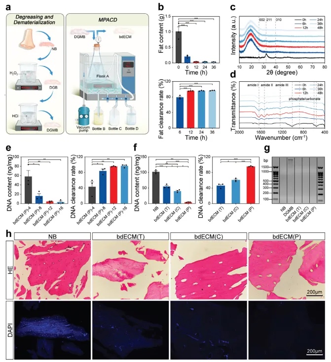 在脱脂过程中,没有使用有机溶剂,而是选择了对组织生物活性影响较小的易去除的H2O2。经过脱脂处理的骨头(DGB)通过盐酸法进行脱矿处理,产生脱脂脱矿骨(DGMB)(图1a)。为了计算组织中的脂肪含量,本文进行了索氏提取实验。在5克的每个骨组织中,脂肪含量仅为0.043 ± 0.006克,而在12小时的脱脂后,脂肪清除率为95.74% ± 0.57%(图1b)。延长脱脂时间并没有显著提高脂肪含量和清除率。