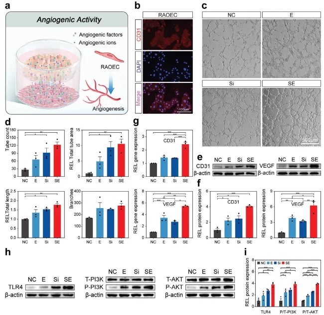 本文分离了大鼠主动脉内皮细胞(RAOECs)并将它们与本实验中的组织工程骨共培养(图5a)。CD31免疫荧光染色显示,提取的细胞呈扁平多边形,且强烈表达CD31,证实它们是原代RAOEC(图5b)。为了评估组织工程骨的血管生成活性,本文进行了管形成实验。如图5c所示,SE组显示出比其他三组更强的管形成能力,E组的表现优于Si组,而Si组则优于NC组。然而,观察研究与随后的统计分析之间存在差异。尽管SE组和Si组的管数、总管面积和总管长度均显著高于NC组,但NC组和E组之间没有观察到显著的统计学差异(图5d)。进一步分析图5c显示,E组的管壁明显更厚,细胞数量更多,表明bdECM-MA促进了RAOEC的增殖。在管壁较厚、同一视野内细胞数量较多的组中,管数、总管面积和总管长度预计会减少。