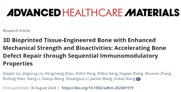 来自哈尔滨医科大学附属第二医院的Xintao Wang团队创新性地开发了新一代组织工程骨结构,它能够时间性调节免疫反应、平衡促炎和抗炎活动,并促进骨再生与修复,以应对大尺寸骨缺损中愈合延迟和非结合的挑战。利用包括多物理场辅助联合去细胞化、侧链生物化学修饰和无菌冻干等创新技术,合成了一种新颖的光固化细胞外基质水凝胶——甲基丙烯酰化骨源去细胞化细胞外基质(bdECM-MA)。将bdECM-MA与硅替代的磷酸钙和骨髓间充质干细胞结合后,通过数字光处理3D生物打印制造出组织工程骨。该研究在体外证实,工程骨保持高细胞活性的同时,达到了MPa级别的机械强度。此外,这种工程骨展现出出色的成骨、成血管和免疫调节功能。免疫调节功能的分子机制之一涉及对p38-MAPK通路的抑制。首创性的体内发现是,基于天然生物材料的组织工程骨表现出顺序免疫调节特性,相继激活促炎和抗炎反应,显著加速骨缺损的修复。本研究为自体骨替代材料的研发和治疗大尺寸骨缺损提供了新的研究基础和有效方法。相关工作以题为“3D Bioprinted Tissue-Engineered Bone with Enhanced Mechanical Strength and Bioactivities: Accelerating Bone Defect Repair through Sequential Immunomodulatory Properties”的文章发表在2024年08月18日的期刊《Advanced Healthcare Materials》。