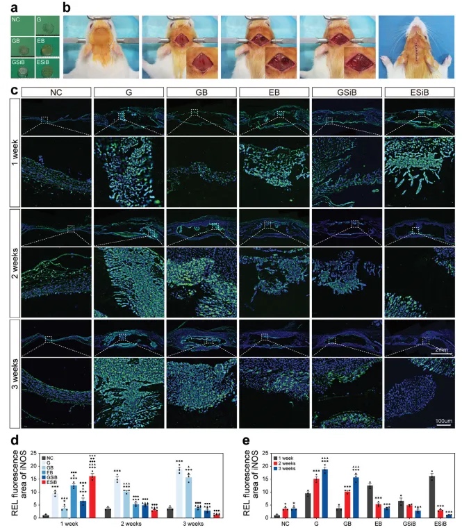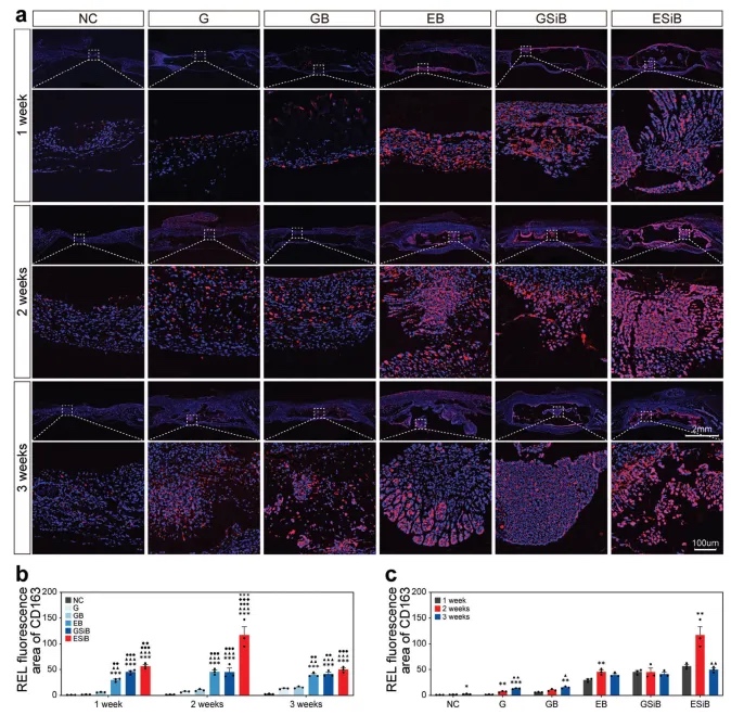 在植入后的第1、2、3周,分别对M1和M2巨噬细胞标志物iNOS和CD163进行免疫荧光染色,以评估不同组别中M1和M2巨噬细胞的募集水平(图8c和9a)。同时,在第二周和第三周,EB、GSiB和ESiB组的iNOS荧光强度明显低于G组和GB组,表明EB、GSiB和ESiB组对持续炎症反应的抑制作用(图8d)。在第一周,含有bdECM-MA的EB和ESiB组显示出更强的iNOS荧光强度,趋势为ESiB > EB > G > GSiB > GB > NC(图8d)。同时,与其他组相比,EB、GSiB和ESiB组的CD163荧光强度适度增加(图9b)。此外,在第二周观察到更明显的趋势,ESiB > GSiB和EB > GB、G和NC,而在第三周,CD163的表达趋势转变为ESiB、GSiB和EB > GB、G和NC(图9b)。随着时间的推移,NC、G和GB组的iNOS荧光强度逐渐增加,而EB、GSiB和ESiB组的iNOS荧光强度逐渐降低(图8e)。在NC、G和GB组中,CD163荧光强度较低,而在EB和ESiB组中,CD163荧光强度依次降低,第二周 > 第三周 > 第一周(图9c)。在GSiB组中,CD163荧光强度保持持续高表达,在第一周、第二周和第三周之间没有显著差异(图9c)。然而,在体外实验中,特别是在SE组中,促炎介质的表达在早期并未观察到组间的显著差异,其表达量并不高于NC组。此外,抗炎介质在早期并未表现出表达增加,随后随时间降低的趋势,特别是在EB和ESiB组中。