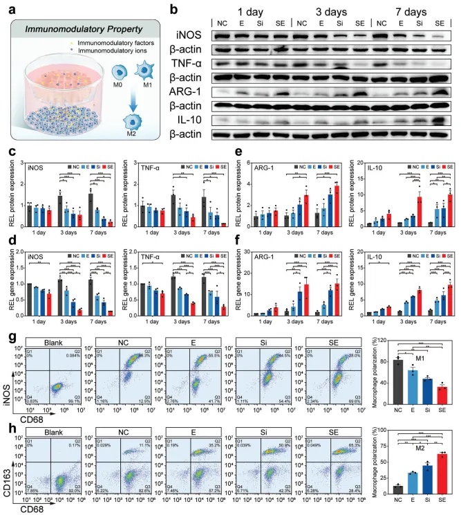 为评估组织工程骨的免疫调节特性,本文从大鼠外周血中提取单核细胞并诱导其分化为巨噬细胞。提取的细胞呈圆形或椭圆形,细胞体无定形,胞质相对均匀。流式细胞分析显示,94.5%的细胞表达M0巨噬细胞表面标志物CD68和CD11b,确认成功提取并诱导了大鼠M0巨噬细胞。随后,使用脂多糖(LPS)将M0巨噬细胞诱导为M1巨噬细胞,诱导后与组织工程骨共培养(图6a)。WB和qPCR分析显示,在NC组中,经过LPS处理后,随着时间的增加,促炎介质(iNOS, TNF-α)的相对表达水平略有增加,其中细胞主要表现出M1表型(图6b-d)。在三个实验组中,尽管第一天没有观察到明显的促炎介质表达减少,但随着时间的推移记录到了逐渐减少,第三天效果最为显著。促炎介质表达水平的降低在SE组中最为显著,而与E组相比,Si组对促炎反应的抑制更为明显。关于抗炎介质(ARG-1, IL-10)的表达,在关键的第三天观察到显著差异,SE组显示出最强的效果(图6b-f)。