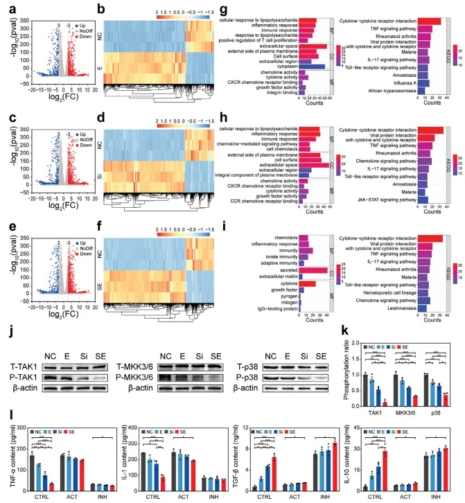 为探索免疫调节特性的具体机制,对共培养三天的细胞进行了基因测序。火山图(图7a-c,e)和复杂热图(图7b-d,f)显示了组间基因表达的显著差异。随后,通过将每组的差异表达基因与潜在的巨噬细胞靶点相交,并构建蛋白质-蛋白质相互作用网络,筛选出按度值排名的前100个靶点进行后续富集分析。从图7g-i可以看出,三组的基因本体(GO)富集分析显示,“炎症反应”和“免疫反应”在生物过程术语中显著富集;“胞浆、细胞外空间、分泌、细胞外基质和细胞表面”在细胞组分术语中富集;“生长因子和细胞因子”在分子功能术语中富集。此外,KEGG通路分析表明,“TNF、IL-17和Toll样受体信号通路”在所有实验组中都得到了富集。