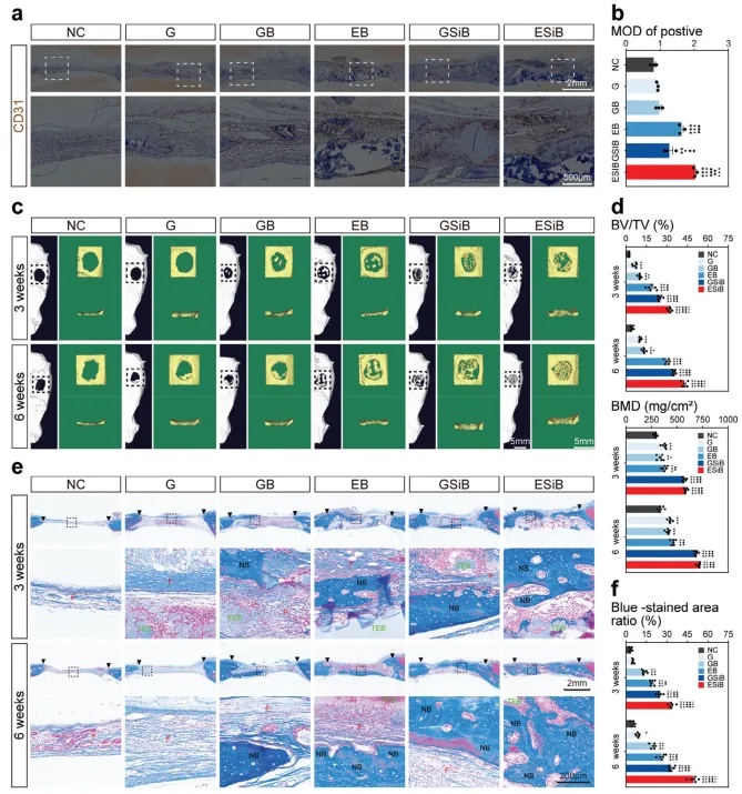 为了进一步研究组织工程骨的免疫调节性能,本文进行了体内实验。分别构建了NC(未植入组)、G组(3D生物打印的GelMA支架)、GB组(3D生物打印嵌入BMSCs的GelMA组织工程骨)、EB组(3D生物打印嵌入BMSCs的bdECM-MA组织工程骨)、GSiB组(3D生物打印嵌入BMSCs的GelMA/Si-CaP组织工程骨)和ESiB组(3D生物打印嵌入BMSCs的bdECM-MA/Si-CaP组织工程骨)(图8a)。将支架和组织工程骨植入到具有关键大小颅骨缺损的大鼠模型中(图8b)。