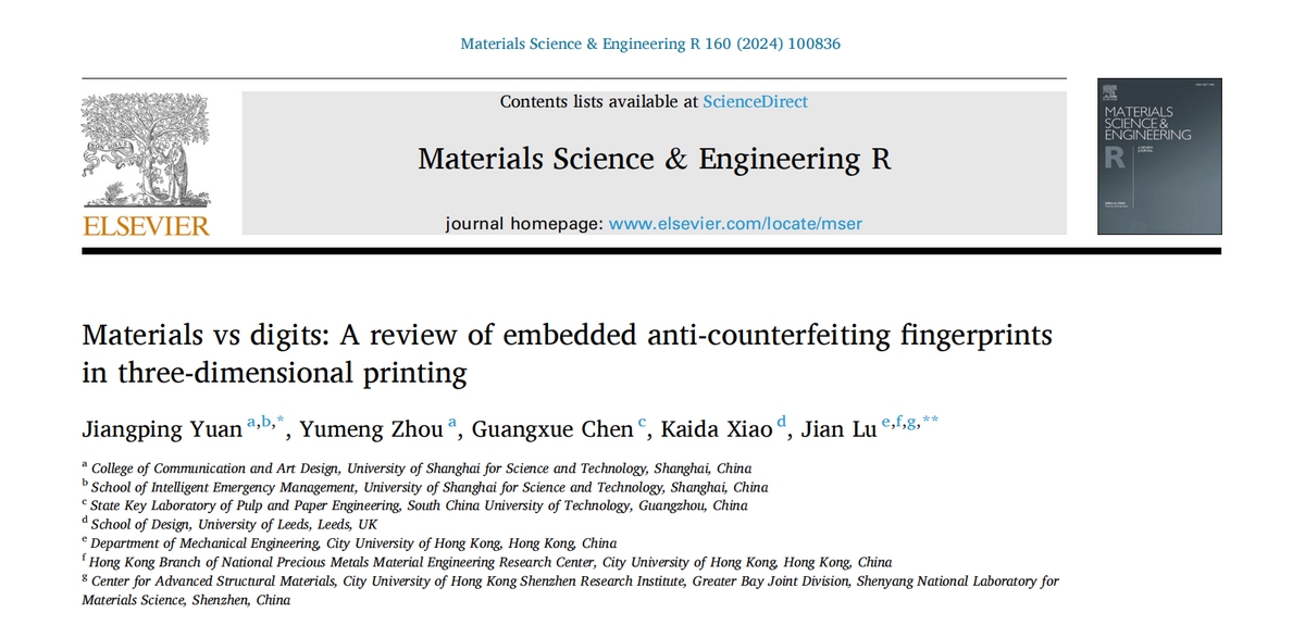 Jiangping Yuan*, Yumeng Zhou, Guangxue Chen, Kaida Xiao, Jian Lu*. Materials vs digits: A review of embedded anti-counterfeiting fingerprints in three-dimensional printing[J], Materials Science and Engineering: R: Reports, 2024,160,P.100836.