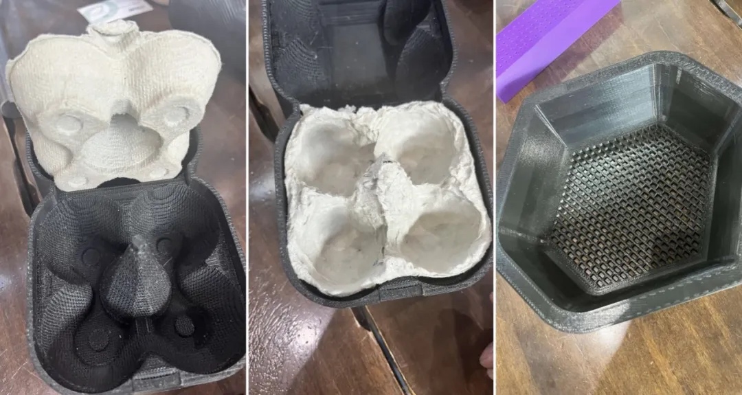 正如前文所述,3D打印技术可以快速打印出不同设计的包装样品,帮助企业在正式生产前进行测试,节省时间和成本。下图是eSUN易生海外客户通过3D打印制作的装鸡蛋的模具以及过滤鸡蛋蛋液的托盘。据客户表述,如果用传统工艺开模,成本较高,而这套模具仅需几十美金,且制作周期更快。目前,此两款设计已经进行了批量化生产。