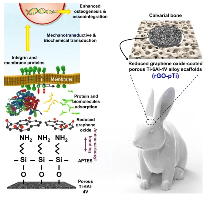 有鉴于此,来自韩国釜山大学的Dong-Wook Han团队开发了涂有还原氧化石墨烯(rGO)的不规则多孔Ti–6Al–4V支架,具体为rGO-pTi,并研究了它们在体内刺激骨整合的能力。