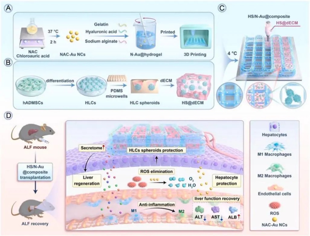 (2)利用3D打印技术,作者将N-Au@水凝胶与HS@dECM水凝胶相结合,制成HS/N-Au@composite,用于原位移植治疗ALF。