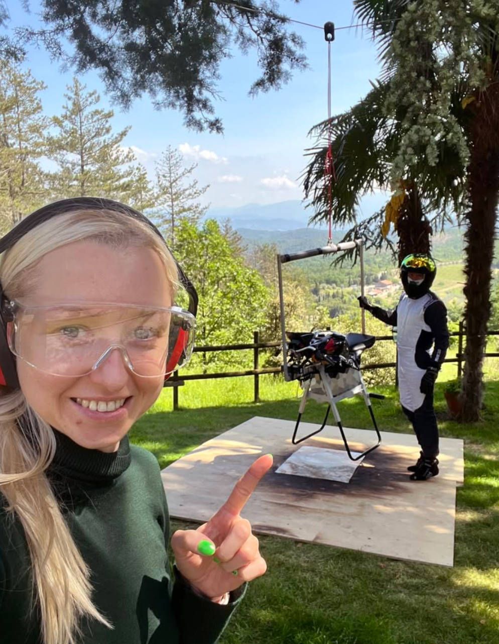 Tomasz此前已在系留状态下对飞行摩托进行了测试。在5月4日,这个全球知名的“星球大战日”,Tomasz身着全套冲锋队员的服装,驾驶Airbike穿梭于森林之中,再现了电影中恩多星(Endor)上飞行摩托追逐的经典场面。据观察,他似乎使用了本田CB 750摩托车的油箱和一台发动机。