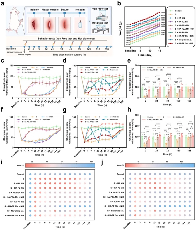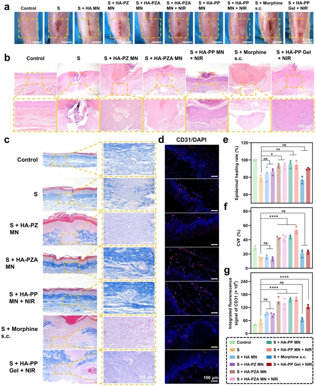 进一步的动物实验表明,该微针系统不仅在减轻疼痛方面表现出色,还促进了创伤愈合过程。NIR激光照射下,微针系统有效激活了局部的血管生成,增强了细胞迁移和新生血管的形成,这为伤口的快速愈合提供了有力支持。通过组织学和病理学分析,研究表明微针系统的应用能显著减少炎症反应,提高了创伤愈合速度。