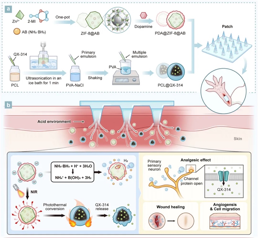 氢气(H2)作为一种无色、无味、无毒且可再生的气体,近年来在医学中的应用逐渐受到关注。研究表明,H2不仅能够抑制制疼痛,还可通过减少炎症和氧化应激促进伤口愈合。因此,我们推测H2能够在术后切口管理中发挥双重作用,既提供镇痛效果,又促进创伤修复。然而,如何在术后创伤的酸性微环境中实现H2的可控和持续释放,仍然是一个技术难题。