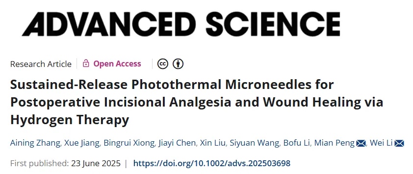 为此,武汉大学药学院黎威教授团队、武汉大学中南医院彭勉教授团队联合开发了一种新型的光热微针系统,通过持续释放H2来缓解术后疼痛,并促进伤口愈合,为个性化镇痛治疗提供了新的解决方案。相关研究成果以“Sustained-Release Photothermal Microneedles for Postoperative Incisional Analgesia and Wound Healing via Hydrogen Therapy”为题发表在期刊《Advanced Science》上。武汉大学第二临床学院博士研究生张爱宁、武汉大学药学院博士研究生江雪为共同第一作者,武汉大学药学院黎威教授、武汉大学中南医院彭勉教授为共同通讯作者。