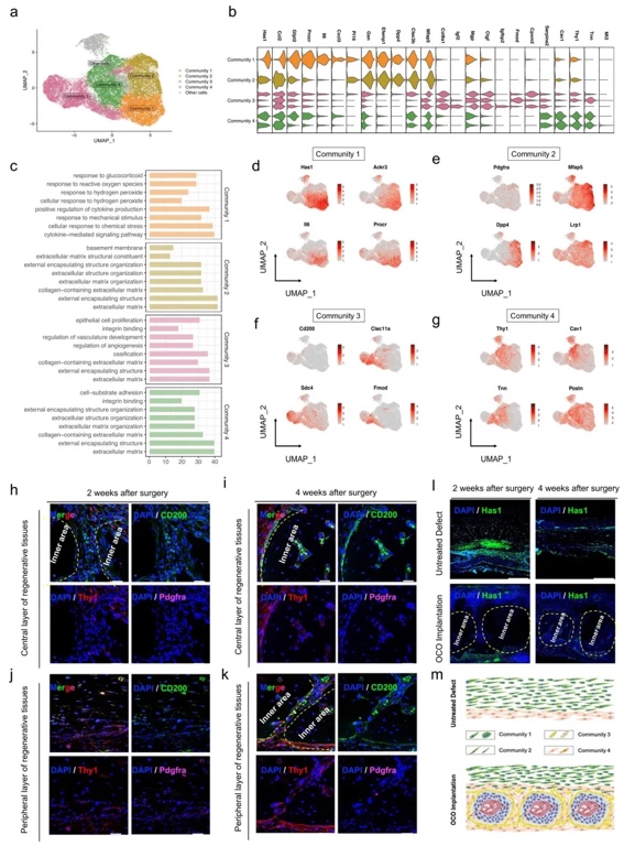 7. 通过差异基因分析与GO富集,定义四个细胞社区(CC1-CC4),结合免疫染色验证其空间定位。结果表明,CC3(Krt8+ SSCs)和CC4(Thy1+ SSCs)主导再生骨组织,而CC1(Has1+成纤维细胞)在未治疗组中广泛分布,社区功能差异与骨再生/不愈合状态相关。