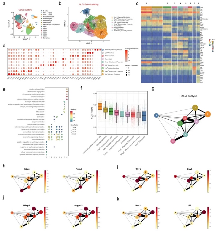 6. 对OLCs进行亚聚类分析,鉴定出9个亚群(如Has1+迁移成纤维细胞、Krt8+ SSCs等),结合基因功能富集与谱系发育分析。结果显示,Krt8+ SSCs和Thy1+ SSCs作为主要干/祖细胞群,且不同亚群参与软骨形成、骨祖细胞分化及纤维化等不同路径。