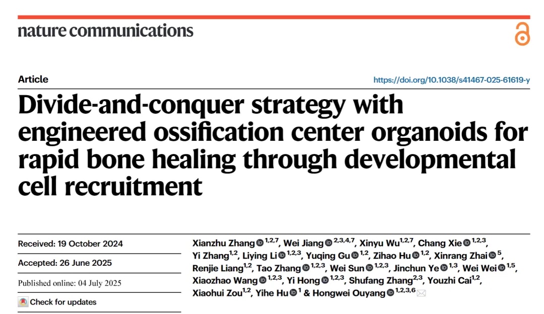 浙江大学基础医学院/良渚实验室欧阳宏伟教授团队开发了骨化中心类器官(OCO),通过3D打印技术构建内核心骨形态发生-神经营养球体与外鞘促血管生成神经营养相的双模块结构,利用“分而治之”策略实现骨缺损处的快速骨桥接。该研究以“Divide-and-conquer strategy with engineered ossification center organoids for rapid bone healing through developmental cell recruitment”为题发表在《Nature Communications》上,为解决临界尺寸骨缺损修复难题提供了新途径。浙江大学医学院附属第一医院特聘研究员张显著为本文的第一作者,浙江大学医学院蒋炜、吴心宇硕士研究生为本文的共同第一作者。浙江大学基础医学院/良渚实验室欧阳宏伟教授为本文的通讯作者。