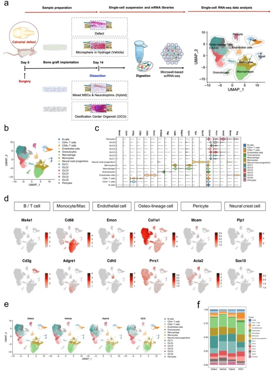 5. 通过单细胞RNA测序(scRNA-seq)分析大鼠颅骨缺损修复2周后的组织细胞,利用UMAP降维与聚类分析。结果鉴定出15个细胞群,包括B/T细胞、单核/巨噬细胞、内皮细胞、成骨谱系细胞(OLCs)等,其中OLCs在OCO组中比例显著变化,为解析骨再生细胞机制提供基础。