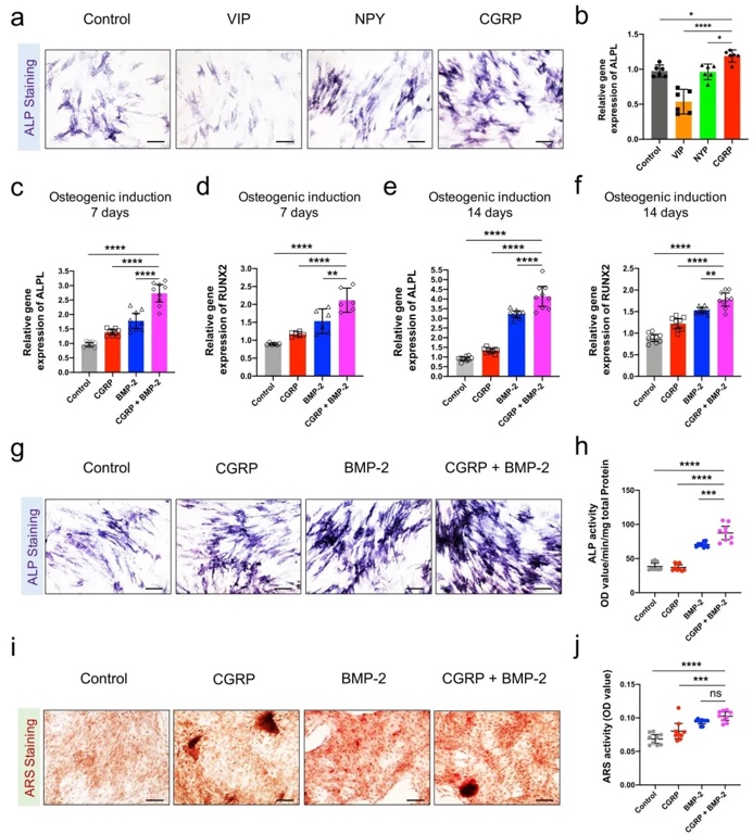 1. 通过碱性磷酸酶(ALP)染色、阿尔新蓝(ARS)染色及实时定量PCR(RT-qPCR)等方法,研究了CGRP与BMP-2在不同浓度组合下对MSCs成骨分化的影响。结果表明,CGRP(10⁻⁸ M)与生理剂量BMP-2(0.5 μg/mL)协同作用时,显著提升ALPL、RUNX2等成骨基因表达及矿化结节形成,且细胞增殖活性增强、衰老标记物减少。