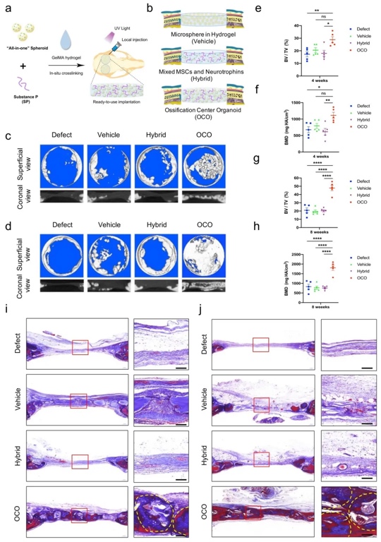 3. 通过大鼠颅骨缺损模型,结合μ-CT扫描和Masson三色染色,比较OCO、双模块水凝胶(Vehicle)及混合MSCs与神经营养因子(Hybrid)组的骨再生效果。结果表明,OCO组在4周和8周时均表现出更高的骨体积分数、骨矿化密度及新骨-旧骨整合度,且形成蜂窝状骨结构及完整骨 marrow腔。