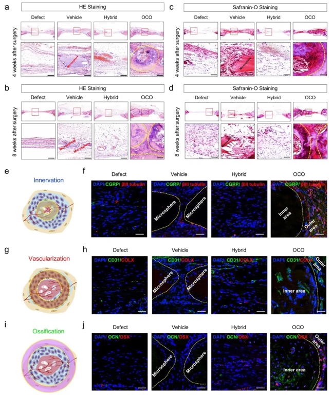 4. 通过HE染色、免疫荧光(CGRP、β-III tubulin、CD31等标记)分析OCO植入后组织形态学变化。结果显示,OCO促进软骨样组织形成并动态转化为骨组织,同时诱导感觉神经纤维(CGRP+)和血管(CD31+)侵入,伴随COLX+肥大软骨细胞及OCN+成骨细胞的有序分布。