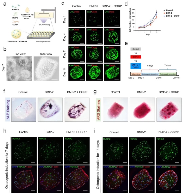 2. 利用数字光处理(DLP)3D打印技术,制备负载MSCs、CGRP和BMP-2的GelMA/HA-NB水凝胶微球,通过活/死染色、免疫荧光及RT-qPCR分析细胞行为。结果显示,直径400 μm的微球具有更高细胞存活率,且CGRP与BMP-2协同促进MSCs在微球内的成骨分化,RUNX2和OCN等标记物表达显著上调。