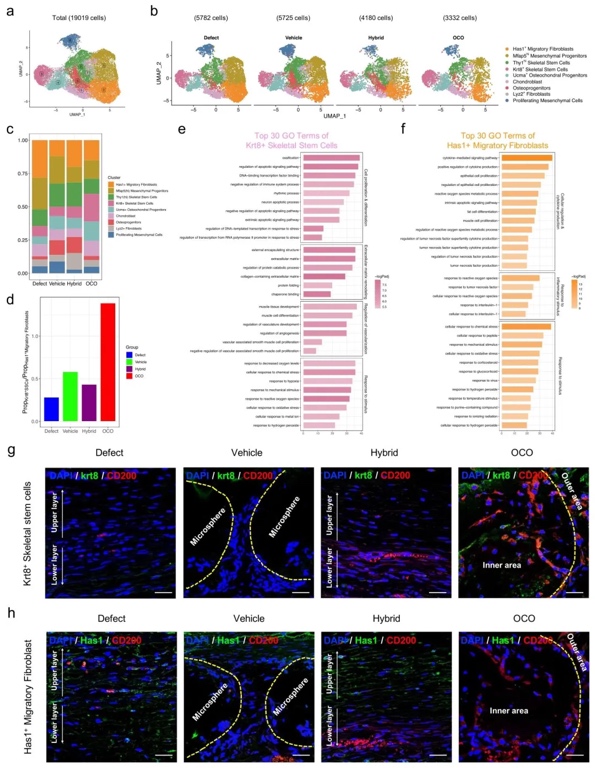 8. 通过scRNA-seq比较各组OLC亚群比例,结合免疫荧光染色(Krt8、Has1等),并利用机器学习模型分析跨物种数据。结果显示,OCO组中Krt8+ SSCs比例显著升高,Has1+迁移成纤维细胞减少,且Krt8+ SSCs与发育中骨组织的细胞特征高度相似。