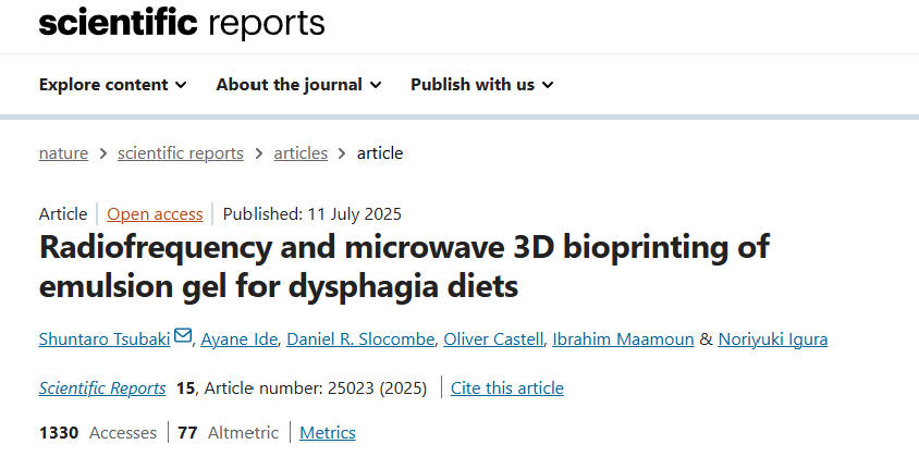 吞咽困难在全球范围内普遍存在,尤其在日本等老龄化社会影响显著。当前,针对该群体的改良质地食品(如果泥、果冻等)存在适口性单一、难以个性化定制的问题。这项研究由Shuntaro Tsubaki带领团队,结合微波工程与生物材料科学,开发出可通过射频(RF)与微波(MW)能量精准调控的3D生物打印工艺,显著提升食品的质地、粘附性及保水性调控能力。