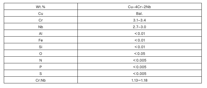 Cu-4Cr-2Nb合金对成分控制要求较高。O、N、Cr、Fe、Al、Si、以及过量的Cr会对导热/导电性能产生不利的影响。冠达科技采用高纯原料真空气雾化生产Cu-4Cr-2Nb合金,优化了熔炼工艺,极大限度的降低杂质,独创的耐火材料表面钝化处理技术,也很好地控制了耐火材料的污染。