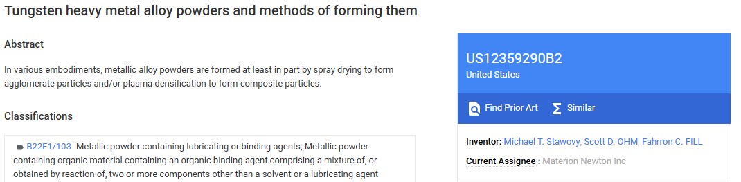 2025年7月31日,美国钨钼制造商Elmet Technologies已获得美国专利号12,359,290,专利名称为 “高比重钨合金粉末及其形成方法”,涉及一种生产钨重金属合金粉末的方法。授权的专利工艺通过改善粉末形态、流动性和致密性,增强了增材制造和粉末冶金应用。