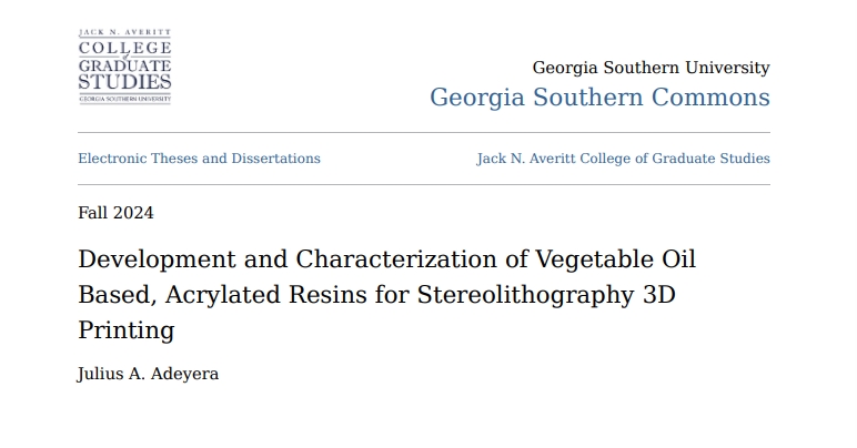 佐治亚南方大学将植物油转化为用于3D打印的生物基树脂