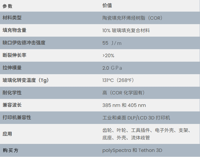 2025年4月25日,先进材料公司polySpectra与陶瓷增材制造专家Tethon 3D联合推出了一款专为工业级3D打印应用设计的全新复合光聚合物树脂ThOR 10。这款材料融合了polySpectra以热稳定性与抗冲击性能著称的环烯烃树脂(COR)平台,与Tethon 3D的专有陶瓷填料技术,旨在为高要求的终端应用部件提供先进的性能解决方案。