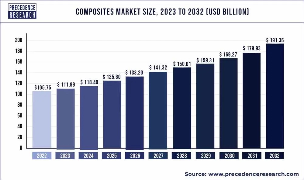 据Precedence Research的统计和预测,2023年全球复合材料市场规模估计为1118.9亿美元,预计到2032年将达到约1913.6亿美元,从2023年到2032年的年复合增长率将达到6.1%。