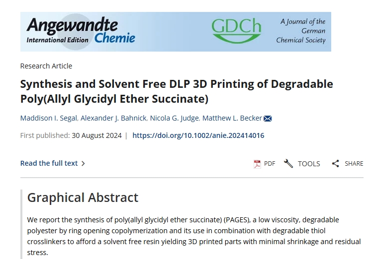 △这项研究的详细内容发表在《应用化学国际版》上,题目为“可降解聚(烯丙基缩水甘油醚琥珀酸酯)的合成及无溶剂DLP 3D打印”(传送门)