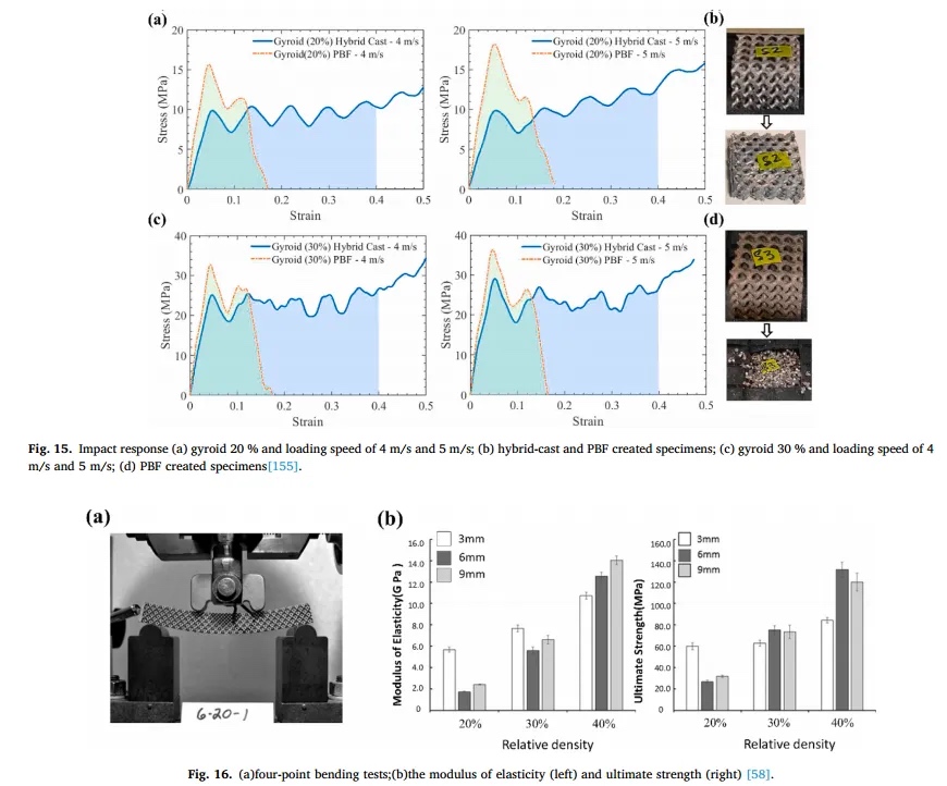 此外,增材制造技术是制备结构复杂的超材料的理想选择,使金属超材料的制造更加方便和高效。但是,超材料的应用存在一定的局限性:(1)复杂结构中残留的金属粉末难以去除。例如,使用SLM和SLS技术制备板材超材料时,难以去除腔内的粉末,导致成型精度差;(2)制备多材料超材料性能差。受成型原理和两种材料热物理系数差异的限制,难以实现有效的界面组合。例如,SLM、DED和FDM在制备多材料超材料时也面临同样的问题。未来,金属超材料的增材制造技术将变得更加高效和低成本,实现更高的精度和分辨率,促进金属超材料的大规模应用。在过去的研究中,金属超材料的力学性能测试取得了显著的进展。通过各种试验方法(压缩、冲击、弯曲)和模拟方法,深入研究了金属超材料的强度、韧性、弹性模量等力学性能。但也存在一定的局限性,如检测方法不全面等。其他机械性能(如疲劳、扭转、剪切)也应予以重视,这些性能在工程应用中同样重要。模拟方法在预测超材料的力学行为方面发挥着重要作用,能够考虑复杂结构的应力分布和变形模式,为实验研究提供了有益的补充和指导。此外,将机器学习引入模拟也有助于预测复杂的机械行为。