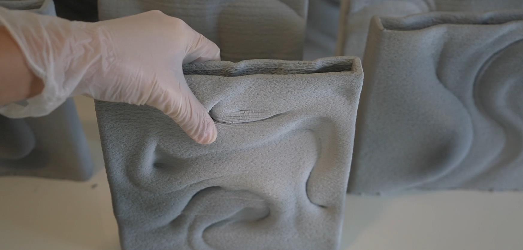 随后,Nawa尝试使用这种基于枣核的材料,制作了一系列3D打印装饰瓷砖,这些瓷砖具有在CAD中设计的独特波浪图案。然后使用挤压工艺垂直打印。最终经过烧制和上釉,这些瓷砖呈现出鲜艳的表面效果。去年10月,在荷兰设计周期间,研究人员精选了15块3D打印瓷砖在埃因霍温展出,获得了广泛的关注。
