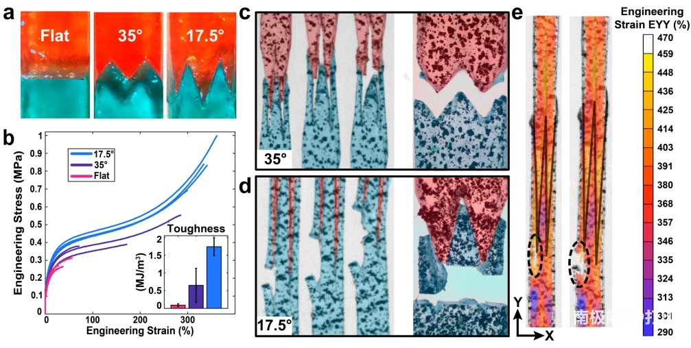 具有35°界面(中等锐度的鱼骨形图案)的嫁接件表现出0.65 ± 0.48 MJ/m³的韧性和176% ± 107%的应变(见图3b),比平面界面高出6倍的韧性。然而,如图3c所示,这些样品大部分沿着嫁接界面发生了粘合性断裂(尽管在相对嫁接件的外边缘观察到一些小碎片)。将鱼骨图案的锐度增加到17.5°,产生了截面面积约为平面样品的3.3倍的界面。在这些样品中,断裂始终发生在远离嫁接界面的位置(见图3d),表明工程嫁接有效地改变了最低断裂能量路径,使其水平穿过样品而不是在自愈界面处。尽管显著增强了愈合材料的性能,但鱼骨齿处的应变集中导致在达到块状样品的原始材料性能之前就引发了断裂(见图3e)。应变集中在测试开始时的牙齿接口处出现,可能是由于两个面之间的对准和几何形状不完善所致。17.5°样品中的断裂事件始于应变集中处,峰值约为460%,这一失败应变与铸造脱水样品中的单轴拉伸失效情况非常吻合。