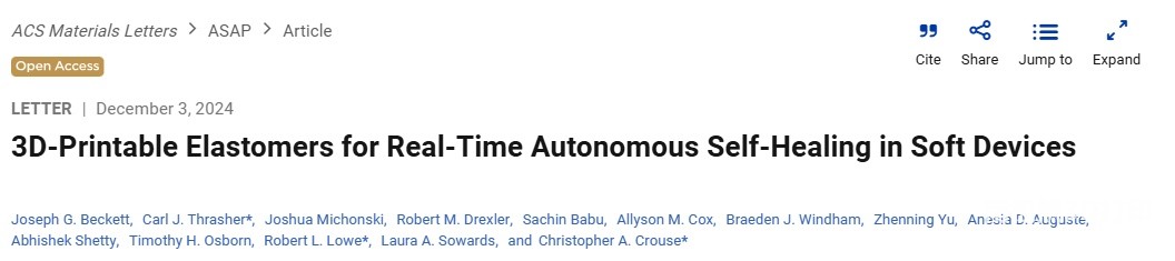 来自美国空军研究实验室的Christopher A. Crouse等团队开发了一种坚韧的3D打印混合型丙烯酸酯/硫醇-烯弹性体(由市售前体制备),在没有外部刺激的情况下表现出几乎即时的损伤修复。这种快速、由氢键驱动的自愈能力使机械性能得到有意义的恢复,包括在损伤后高达344%的拉伸应变。此外,结构化的人字形移植展示了一种引人注目的策略,能够在远离愈合界面处实现内聚性失效,仅通过适度增加界面表面积,实现了高达18倍的韧性提升。使用立体光刻技术制造的原型软机器人设备在环境条件下无需外部干预即可在几秒钟内自愈。这些结果表明了一种可扩展的策略,可以在损坏的软体设备中提供实时、自主的功能恢复。相关工作以题为“3D-Printable Elastomers for Real-Time Autonomous Self-Healing in Soft Devices”的文章发表在2024年12月03日的期刊《ACS Materials Letters》。