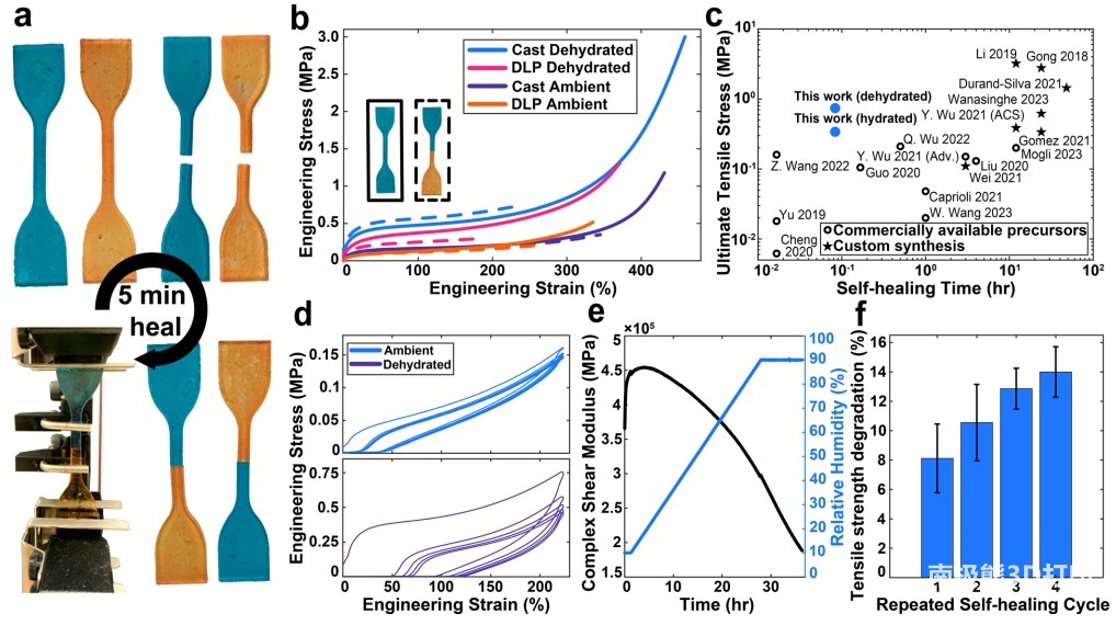 量化自愈材料表现出的粘弹性程度对于确定其在实际应用中的性能至关重要,特别是那些需要快速响应的应用。对于本文报道的材料,粘弹性程度显著依赖于水分含量,这是因为氢键的作用。对脱水铸造样品进行的循环拉伸试验显示出明显的滞后和逐周期软化(见图2d)。然而,在常温储存样品上进行的测试显示出较少的滞后和较弱的逐周期软化。这表明,虽然水的增塑性质牺牲了一些强度和模量,但它有助于最小化材料响应的时间依赖性,可能是通过削弱临时键的贡献实现的。最终,这种更完美的弹性(更少的损失)行为可以产生对外部驱动更敏感的设备。