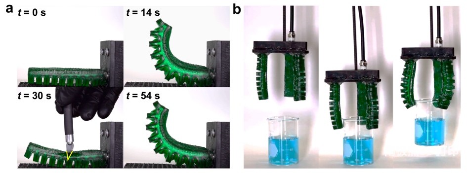 为展示这些材料适用于软体机器人应用,三个相同的执行器被连接到一个定制夹具上,形成一个三指抓持器(见图4b)。软体机器人抓持器放置在一个装满100 mL蓝色水(总重量为165 g)的150 mL玻璃烧杯周围。手动将手指放在烧杯边缘并驱动到约1.5 psi就足以抓住并抬起烧杯。通过将提起的烧杯横向移动几秒钟来测试抓握的稳定性,最后释放烧杯。轻松释放表明,粘附力在悬挂烧杯时没有起到重要作用。成功的三指抓持器展示了这种材料具有适合作为有效软体机器人执行器的机械性能。随着执行器和夹具设计的改进,抓持器的提升能力可能会显著增加。