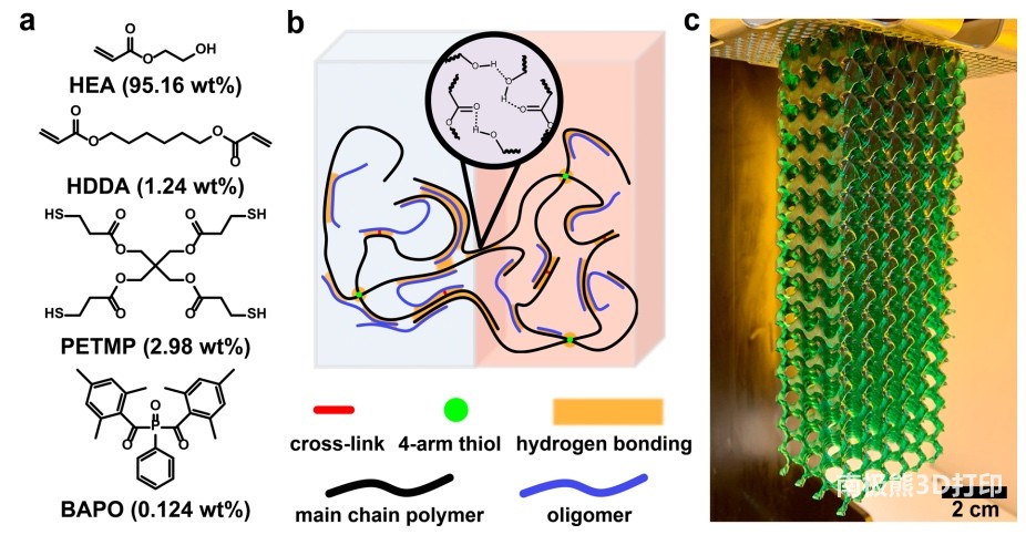 树脂系统的设计目的是易于大规模生产,仅使用商用现成化学品(COTS chemicals)。树脂的组成包括一个氢键单体2-羟乙基丙烯酸酯(HEA)(95.16 重量百分比),双链转移剂和交联剂季戊四醇四(3-巯基丙酸酯)(PETMP)(2.98 重量百分比),己二醇二丙烯酸酯(HDDA)(1.24 重量百分比)交联剂,以及作为光引发剂的苯基双(2,4,6-三甲基苯甲酰基)膦氧化物(BAPO)(0.124 重量百分比)(图1a)。水基绿色食品染料(0.497 重量百分比)用于防止打印过程中光线过度穿透,从而提高打印表面的质量与分辨率。