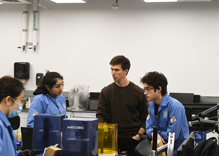 △学生团队回顾他们的3D打印成果,并讨论改进树脂配方的后续步骤。JosephIMongane